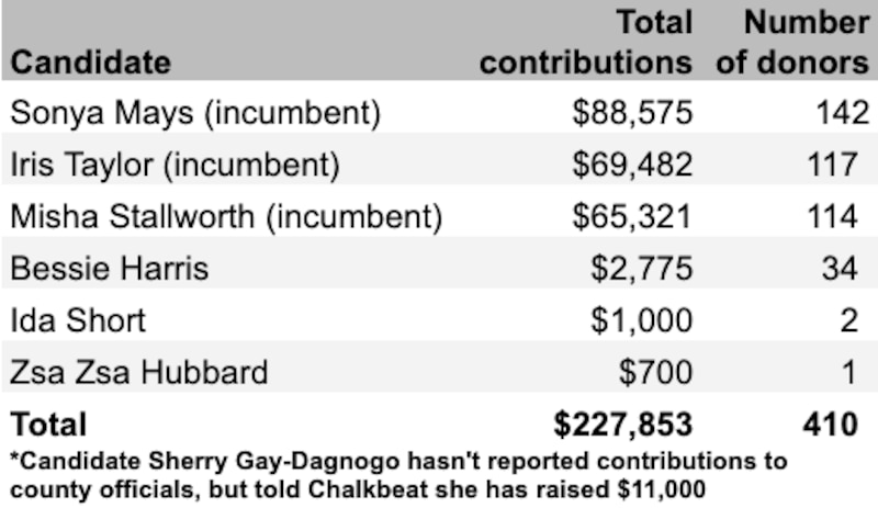 Almost all of the reported contributions went to the three incumbents: board President Iris Taylor, Treasurer Sonya Mays, and Secretary Misha Stallworth. At least one challenger, Sherry Gay-Dagnogo, missed the deadline for reporting contributions and faces a late filing fee. She says she has raised $11,000 to support her campaign and has also tapped funds she raised as a state representative.