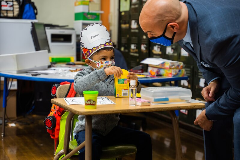 Detroit Superintendent Nikolai Vitti traveled to multiple buildings Tuesday, arriving at Harms shortly after 9 a.m. Vitti walked through the building and visited classrooms, weaving around the tiny desks and greeting some of the students with elbow bumps. One student dropped her drink on the floor, and Vitti helped clean up the spill.