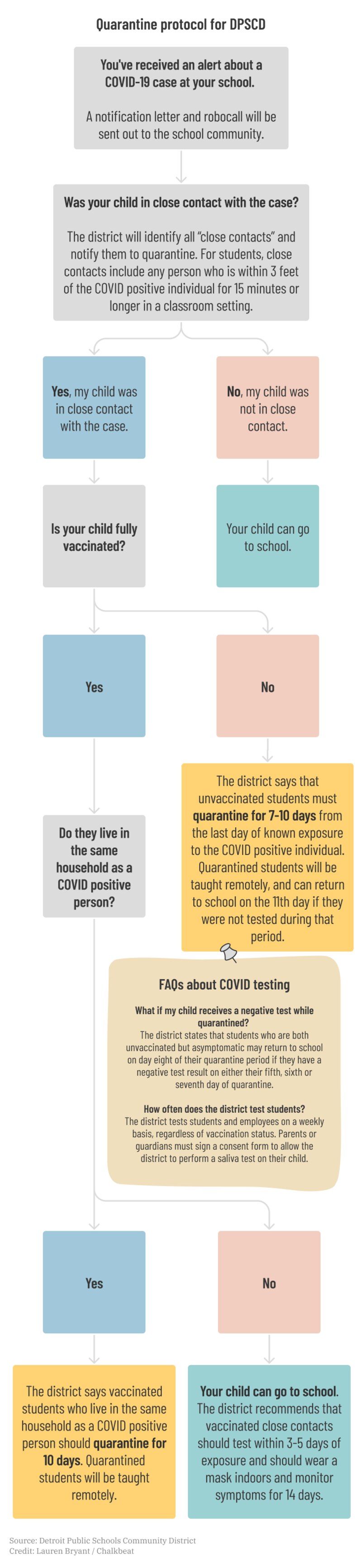 Below we’ve provided a breakdown of the district’s quarantine protocol as of Sept. 27. Have more questions? Has your family gotten a notice? We want to hear from you how learning at home is going during your child’s quarantine period. Tell us at detroit.tips@chalkbeat.org.