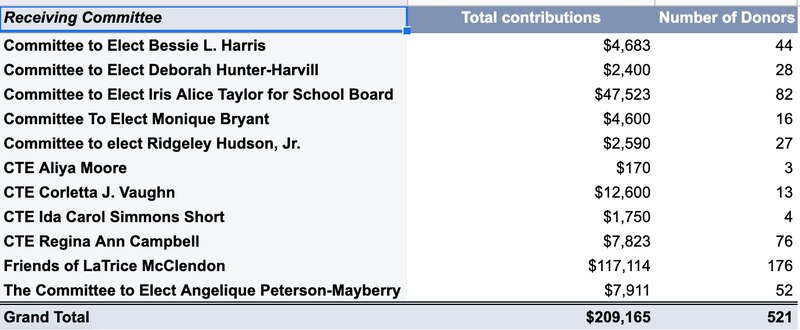 Trailing McClendon is former school board member Iris Taylor, who has received over $47,000. Taylor led the board as president from 2017 until she lost her reelection bid in 2020. Incumbent Corletta Vaughn came in third with over $12,000 in donations, while the remaining candidates who filed fundraising records all reported below $10,000.
