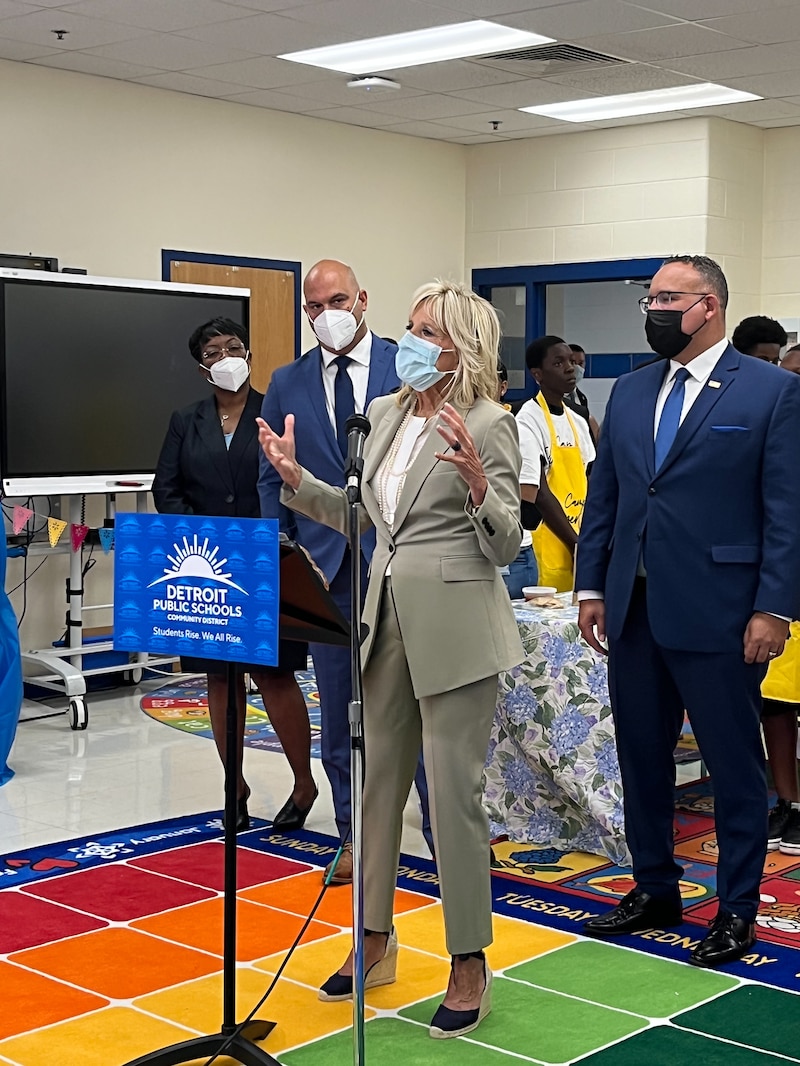Except on this day, their six-person class at Detroit’s Schulze Academy for Technology and Arts would be joined by some new faces: a swarm of press, a huddle of security personnel, U.S. Education Secretary Miguel Cardona and first lady Jill Biden.