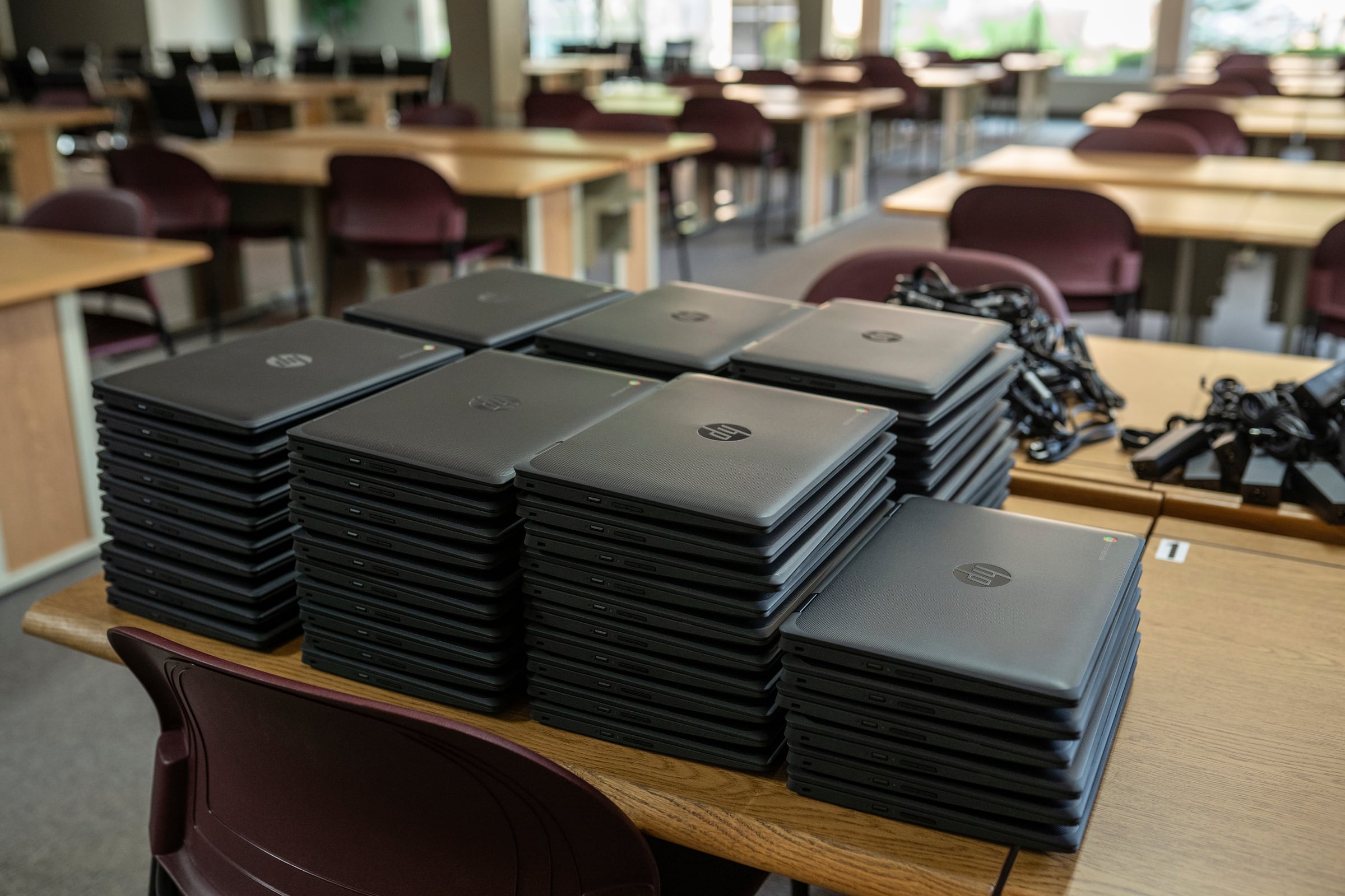 Tall stacks of new Chromebooks sit in the school’s library. Much of the funding went to upgrading technology, which was desperately needed, Luetzow said. In total, $56,662 went to buy 181 Chromebooks.