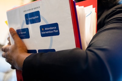 She walked around the school with a large binder that she uses to track absences and excuses, and interactions with families. Every month, she must provide a report to the district.
