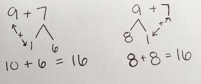 One volunteer wanted to make 9 into a 10 to make adding easier. So she split seven in two parts — a one and a six — then took the one and added it to nine. Now she had 10 and six, which add easily to make 16.
