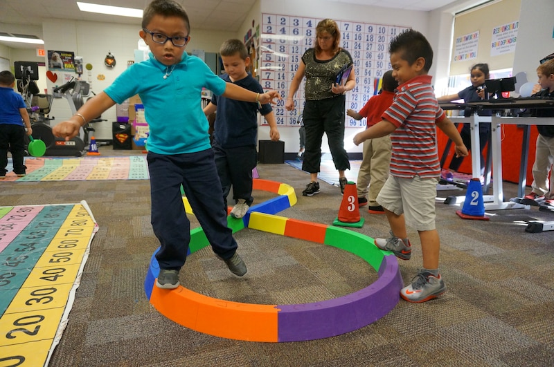 In addition to yoga balls in every classroom, the school has standing desks and exercise equipment students can use during class — such as pedals under desks, stools that spin and child-size ellipticals.