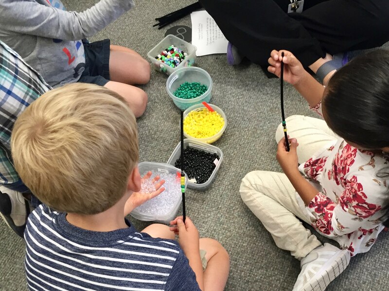 Kristin Poindexter sits on the floor with her feet tucked beneath her, quietly motioning to the group of students in front of her as they hover over containers of colored beads and a pile of black pipe-cleaners.