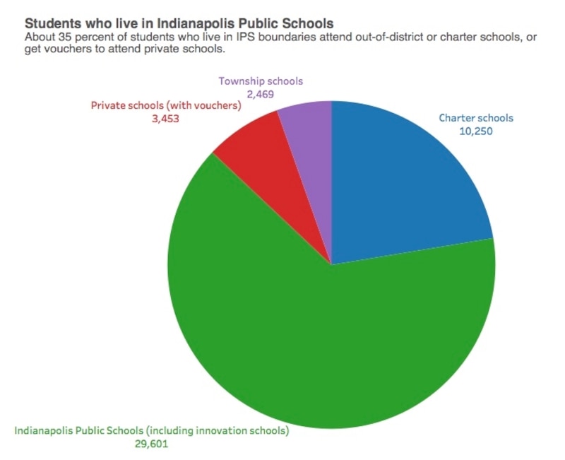 But in more recent years, the flow of students out of the district has been fueled by policy decisions from state lawmakers that have promoted school choice programs touted by national policymakers like U.S. Secretary of Education Betsy DeVos. The legislature has given families state dollars to pay private school tuition. It has made it easier to open charter schools and for students to attend public schools in neighboring districts. Last year, IPS enrolled about 30,000 students.