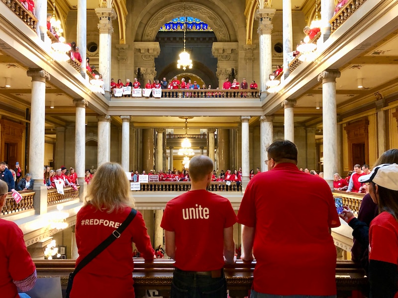 With lines still snaking out doors on both sides of the Statehouse nearly an hour past the scheduled start time, the rotunda was filled with adults and children in red shirts showing their union support. Teachers and their friends and families crowded around two floors of railings overlooking the stage on the main floor, occasionally bursting into loud chants that echoed off the walls and marble floors.