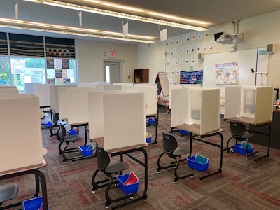Numerous signs posted throughout the school remind people to wash their hands and wear their masks. Each classroom has new hand sanitizer dispensers installed by the door. Boxes filled with masks and face shields for students occupy the storage room, as in-demand this year as pencils and computer paper.