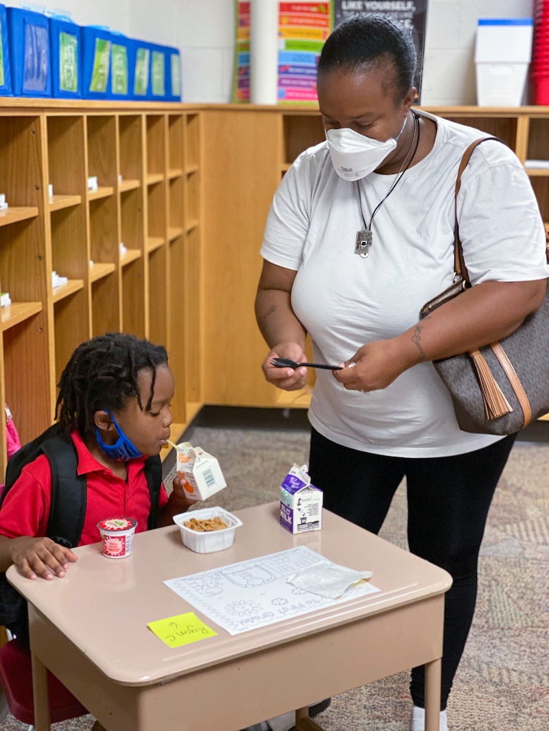 At school, the twins followed their big sister, sixth-grader Ra’Zya, as they walked to the breakfast line. They tried holding onto milk, orange juice, Golden Graham boxes, and yogurt all in their hands as they walked to class. Sometimes they dropped their plasticware.