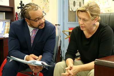 Gregory reviewing school data with Sussex Avenue Renew School Principal Darleen Gearhart. (Patrick Wall)