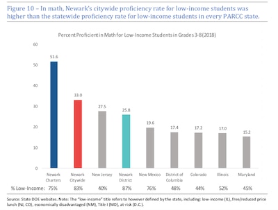 Newark also got a larger share of low-income students to pass the tests than did the District of Columbia and the five states — Colorado, Illinois, Maryland, New Jersey, and New Mexico — that use the tests, known as PARCC. Newark’s charter schools drove the city’s high performance. But the traditional schools still had more needy students pass the PARCC tests than other large districts, including Baltimore, Chicago, Denver, and D.C.