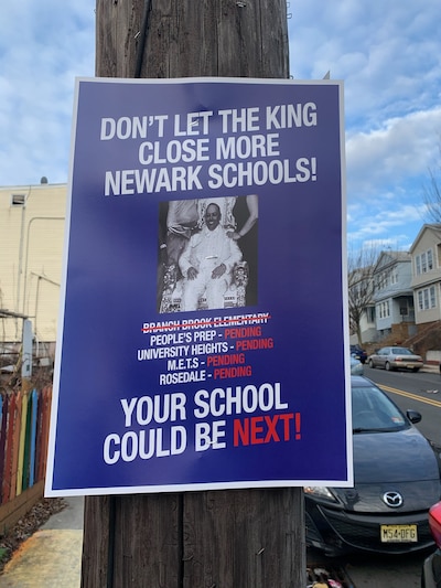 “Don’t let the king close more Newark schools!” the poster reads. “Your school could be next!”