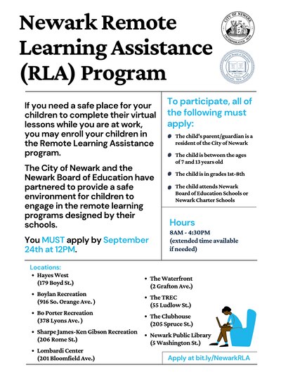 Eligible families will be able to send their children to nine sites across the city where students can attend online classes under adult supervision and receive breakfast and lunch. Operated by the city of Newark and the school district, the free program will ensure that students can learn remotely in a safe space with internet access while their parents or guardians are at work, officials said.