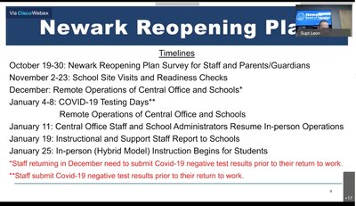 Newark has kept schools shuttered since March after twice nixing plans to reopen classrooms this fall due to the city’s high infection rate. The tentative plan now is for teachers to begin reporting to schools on Jan. 19 and students who opt in to arrive the following week. In preparation, the district told teachers they must get tested for the virus this week.