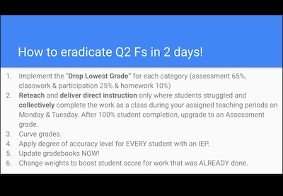 Teachers could let students complete assignments “as a class” instead of on their own, drop students’ lowest grades, or give extra weight to work students already submitted, another slide said. Its title: “How to eradicate Q2 Fs in 2 days!”