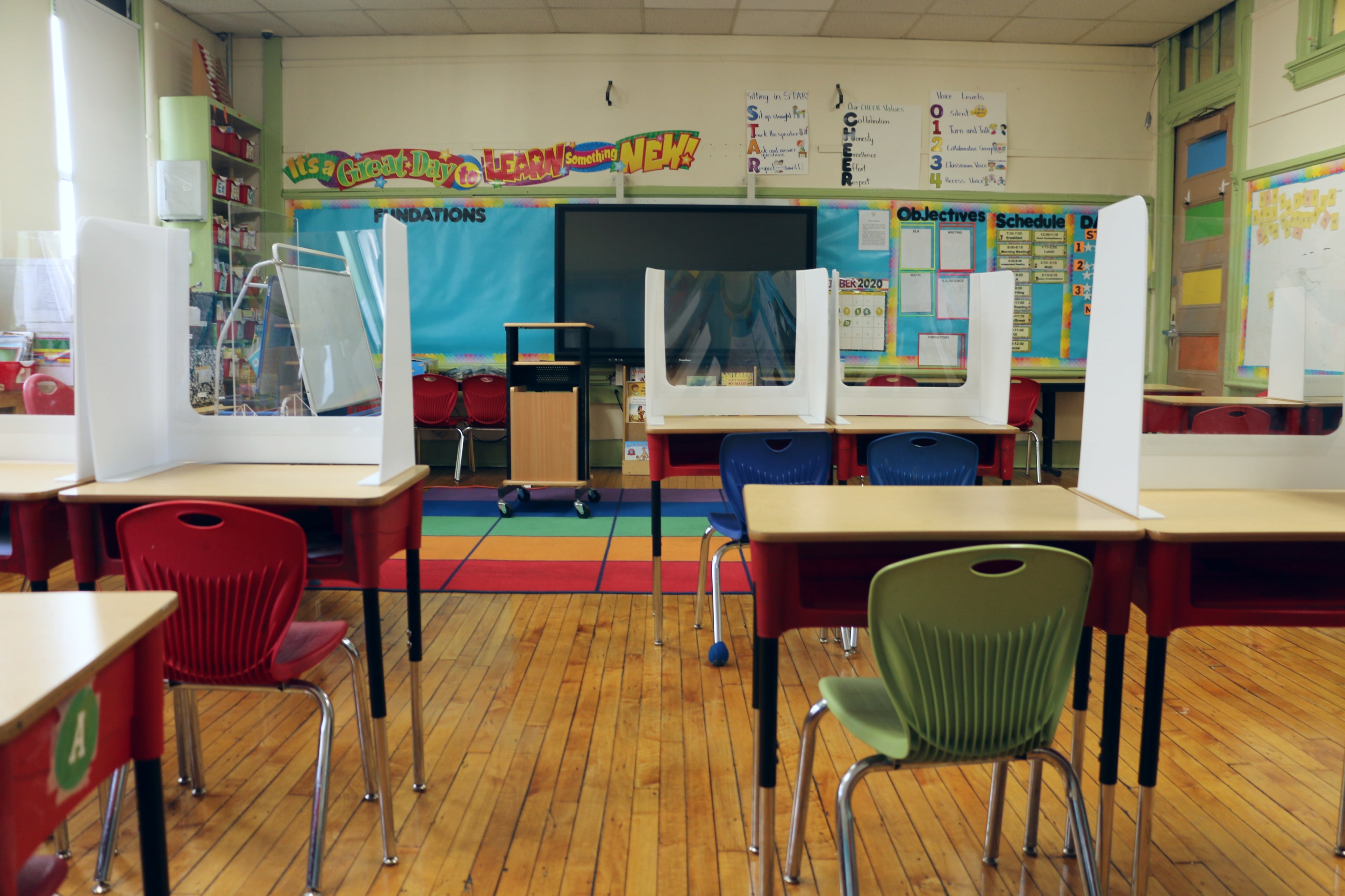 Only students and employees are allowed inside schools (no parents or visitors), and everyone must wear masks. Plastic dividers have been installed in main offices, and student desks have been spaced six feet apart and topped with three-sided barriers. Class sizes are not expected to exceed 10 students.