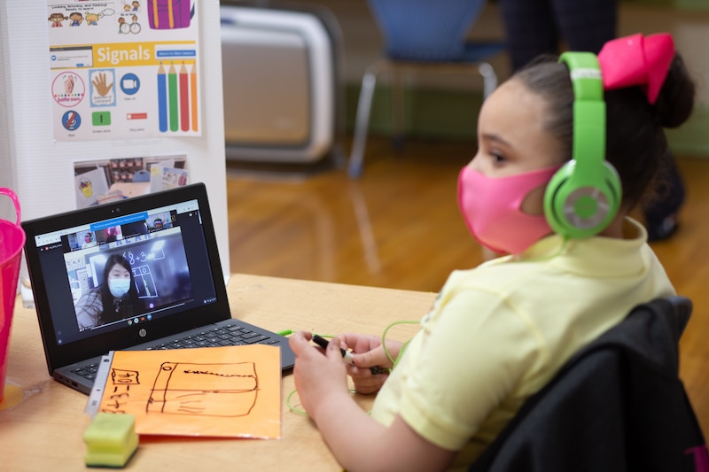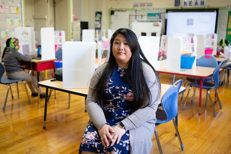 En un salón de primer grado, Molisa Cheng estaba enseñándoles a sus estudiantes en línea y presenciales ando una lección de lectura sobre la “mágica E muda”. Los cuatro estudiantes en el salón estaban sentados detrás de escudos de plástico y en pupitres muy separados. En vez de ver a la maestra Cheng en persona, la miraban en las pantallas de computadoras portátiles y escuchaban a través de gruesos audífonos. Durante el trabajo independiente, el único sonido era el zumbido del recién comprado purificador de aire.