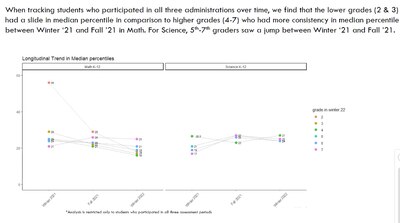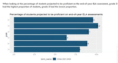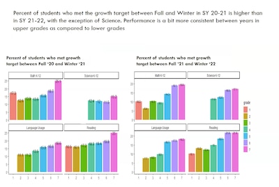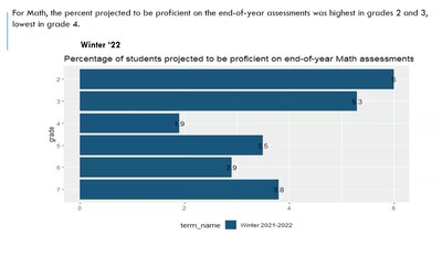 In math, just 6.4% of second graders and about 20% of seventh graders made the expected amount of progress from fall to winter. In reading, the percentage of students who met growth projections ranged from 10% of first graders to about 22% of seventh graders.
