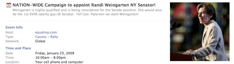 Did Weingarten ever really consider taking the seat? At first, I thought she was having her name floated simply as a way to raise her image and political stature, not because she was serious. But lately I’ve been getting the sense from people Weingarten consults that she sincerely considered changing jobs. The fact that this Facebook campaign doesn’t hurt that idea.