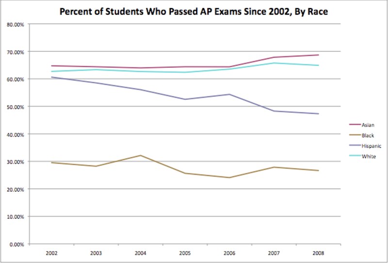 Meanwhile, though it’s impossible to calculate the exact percentage of students that took AP exams, a rough estimate* suggests that participation rates are still very low. Only 12% of black eleventh- and twelfth-graders and only 16% of Hispanics took at least one of the exams in 2008, by the rough estimate, up from 9% and 14% respectively in 2002.