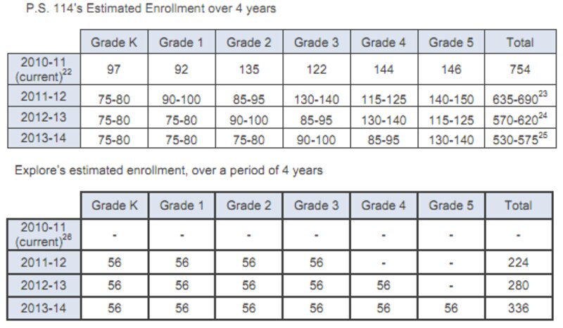 According to the city’s Educational Impact Statement, in the next three years, P.S. 114’s enrollment will shrink from 754 students to 530-575. At the same time, the Explore Excel Charter School will grow to serve 336 students in kindergarten through fifth grade.