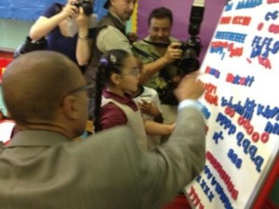 8:43 a.m. Before speaking with reporters, Bloomberg and Walcott make another stop at the New Settlement Campus, this time in a kindergarten class where teacher Rachel Garcia is reading aloud from “Marco Goes to School.” It’s a children’s book that aims to assuage concerns about the transition to school.