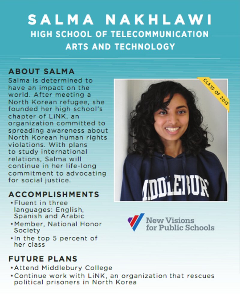 Salma Nakhlawi is one of 10 graduating seniors honored by New Visions for Public Schools for their accomplishments this year. Read about all of the winners, then revisit our coverage of honorees from previous years.
