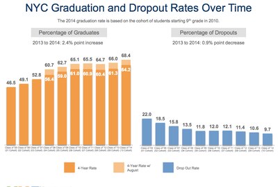 This year, 9.7 percent of students quit high school, down nearly one point from last year. At the same time, the share of black and Hispanic students who earned diplomas in 2014 grew by about 2.5 points each, shrinking the still-sizable graduation divide between them and white students. Students with disabilities made the most gains, with their graduation rate rising by 3.4 points.