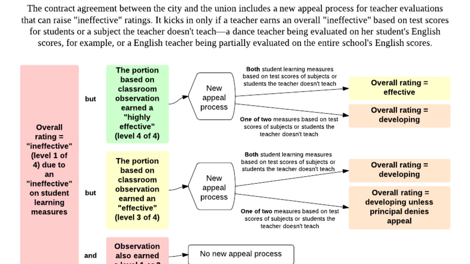 City and union officials said they had thousands of teachers like this one in mind when they agreed to a new appeal process as part of their contract agreement. Beginning this year, the process makes it easy for an “ineffective” rating to be boosted if it’s based on test scores of subjects and students that the teacher does not teach—as long a supervisor gives the teacher higher marks.