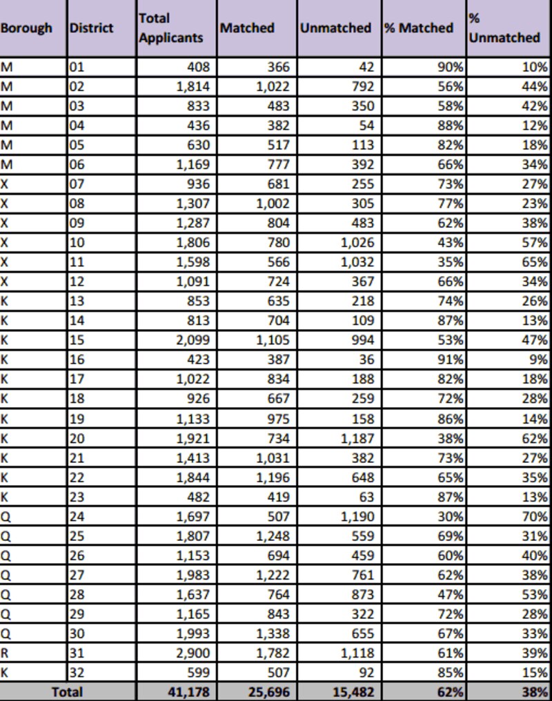 Brooklyn’s District 16, which includes much of Bedford-Stuyvesant, saw the highest percentage of students matched, with 91 percent of applicants placed in a public school program. In Queens’ District 24, where most elementary schools are overcrowded, only 30 percent of applicants were placed in a public school program.