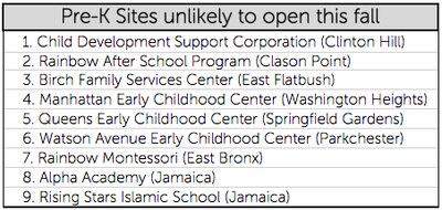 Nine pre-K sites will not open this week because they failed to meet safety or health standards, city officials said Tuesday. The 265 children affected will be reassigned, since their programs are “unlikely to open this year” at all.