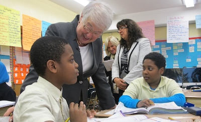 Throughout her visit, she said P.S. 123 needs to stay focused on improving its writing instruction and tying it into every class. (She told two different art instructors to add more writing to their projects, and asked a kindergarten student to show her some of her writing.) She also said Hernandez must boost the school’s attendance rate, perhaps by having older students check in on younger ones through a “phone buddy” system or buying alarm clocks for others.