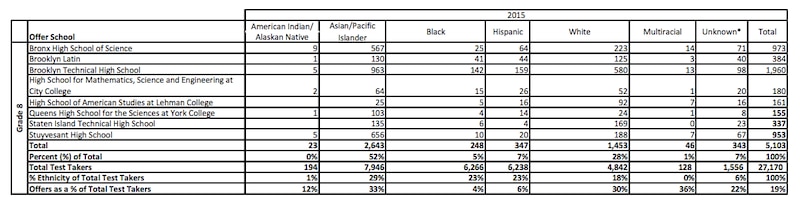 The numbers follow the release of a report from the Research Alliance for New York City Schools showing that replacing that exam with a combination of other factors like state test scores, class grades, and attendance wouldn’t increase diversity at those schools in a significant way. That report also noted that more than half of the students admitted to specialized high schools from 2005 to 2013 came from just 5 percent of the city’s middle schools.