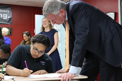 A month after New York City Mayor Bill de Blasio blasted charter schools for focusing too heavily on test prep and excluding high-need students, he dropped by KIPP Infinity Middle School for a photo-op with students and the co-founder of one of the country’s largest charter networks.