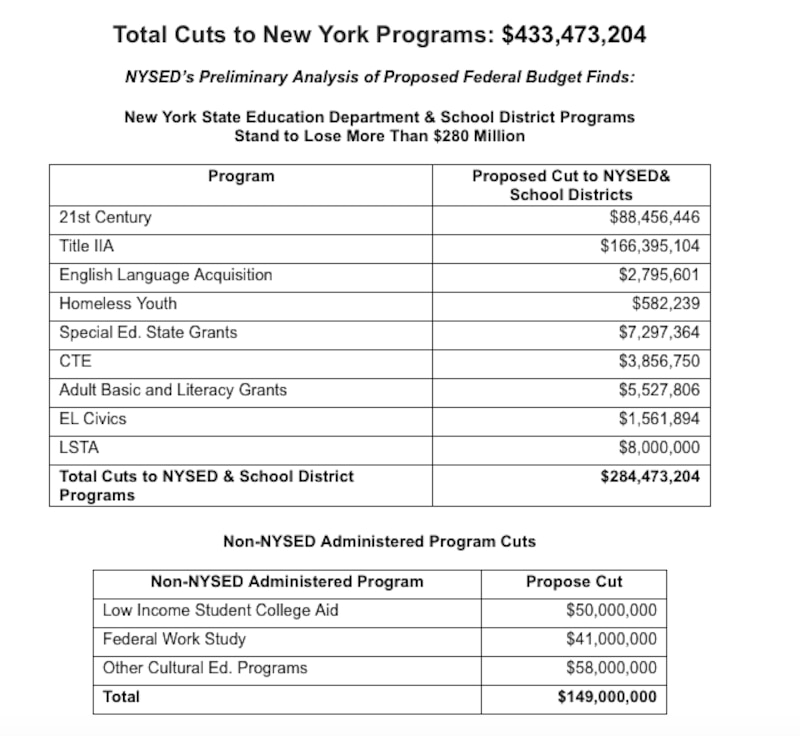 President Donald Trump’s proposed federal budget would “eviscerate” education programs by cutting more than $433 million in New York funds, according to state officials.