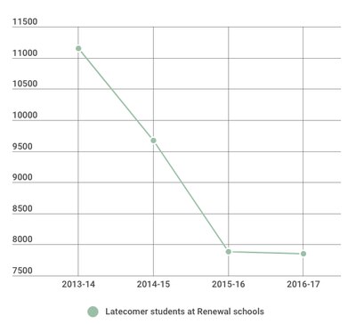 The statistics education officials provided for this story does not include school-level breakdowns, making it difficult to tell if the city is still clustering lots of latecomers at certain Renewal schools, or whether struggling schools outside the Renewal program have received fewer latecomers.