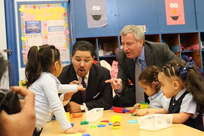 De Blasio and Carranza channeled their inner children at PS 25 The Bilingual School. They squeezed into tiny tables and played with Play-Doh and food from a toy kitchen as they chit-chatted with the youngsters.
