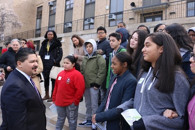 Carranza’s next stop is a tour of Bronx Community College with a group of 7th graders from PS/MS 279, as part of College Access for All. The initiative, founded under Mayor de Blasio, helps school build a culture around college and careers.