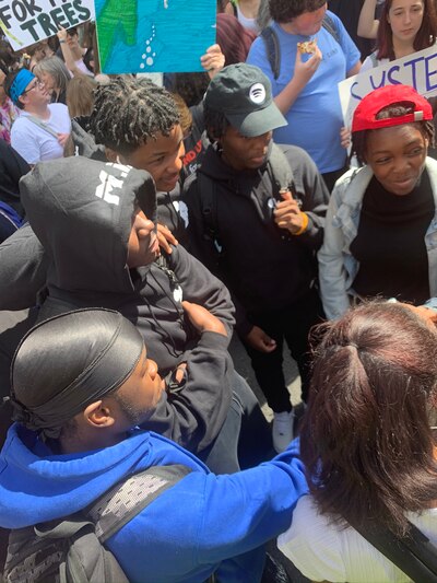 The episode opened with interviews with marchers. Pretty quickly, the students, all of whom are Black, noticed they did not see many people who look like them at the event. They were “deep in Manhattan,” as senior and podcaster Jamar Thompson put it, and a long journey for people in some majority black neighborhoods like Canarsie or East Flatbush, where Jamar lives.