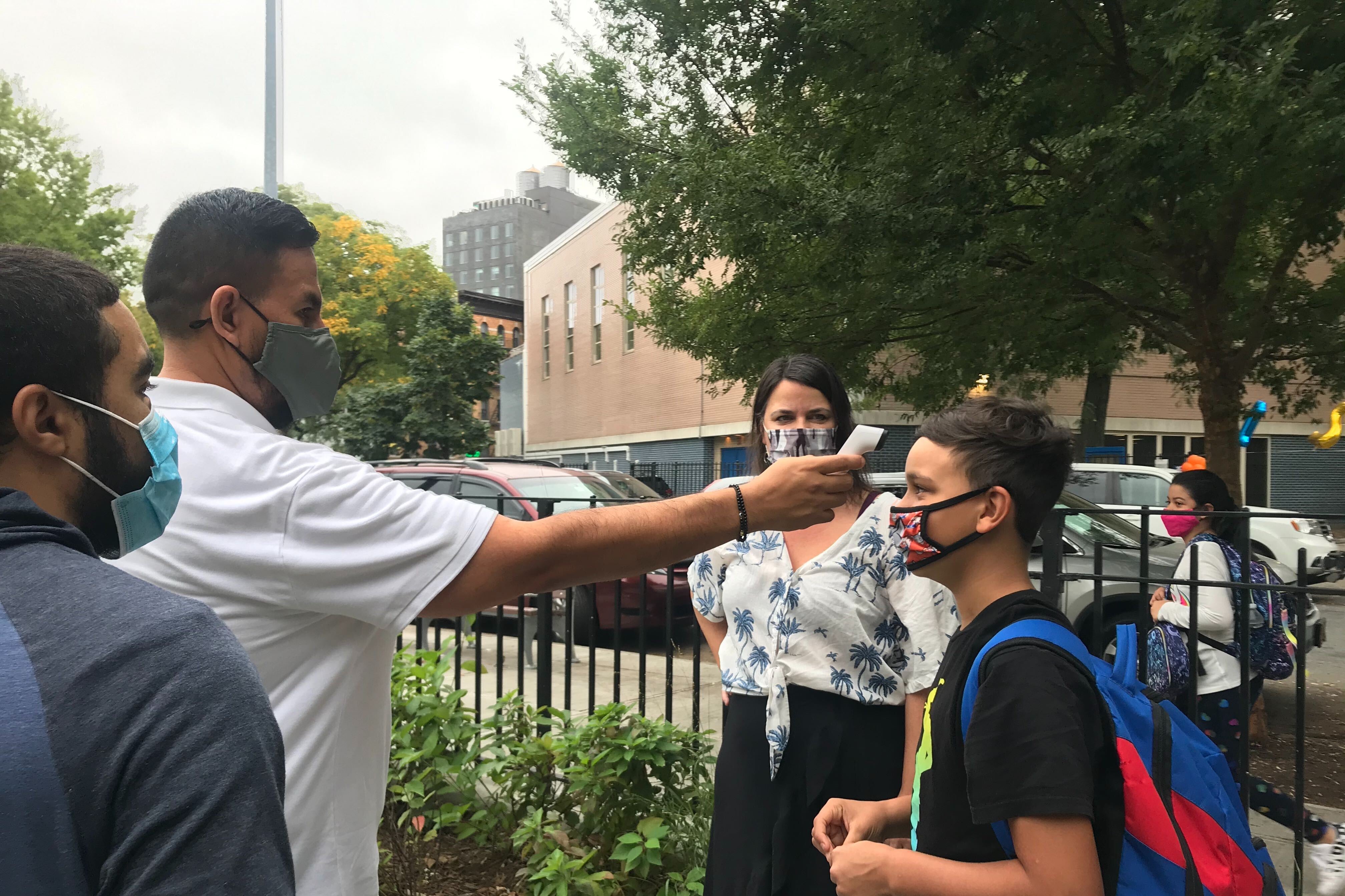 As parents dropped off their children for a break from at-home learning, anxious students lined up for temperature checks, and teachers greeted students with smiles, asking, “Do you remember me from the video?” Fewer than 200 students were expected on the first day of in-person classes. At least one family showed up on the wrong day, a mistake many parents might fear as they juggle schedules for different children with in-person days varying week to week.