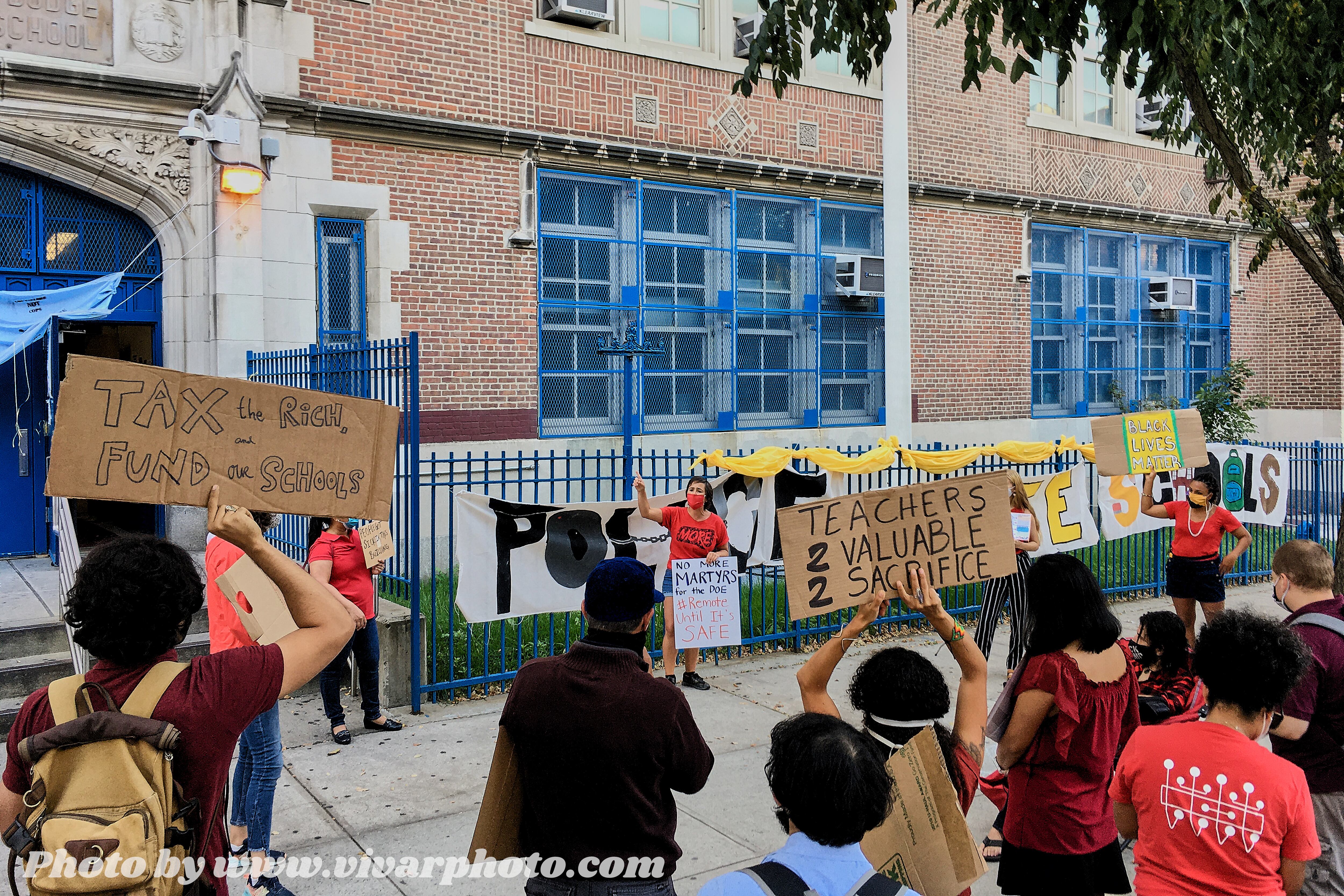 Soto and his colleagues at Crotona International High School rallied outside the building on Tuesday morning to highlight their safety concerns and demand that the school year begin with remote instruction only.