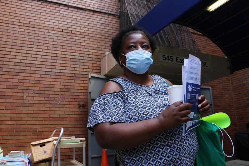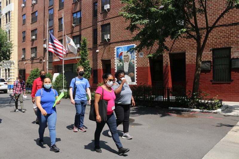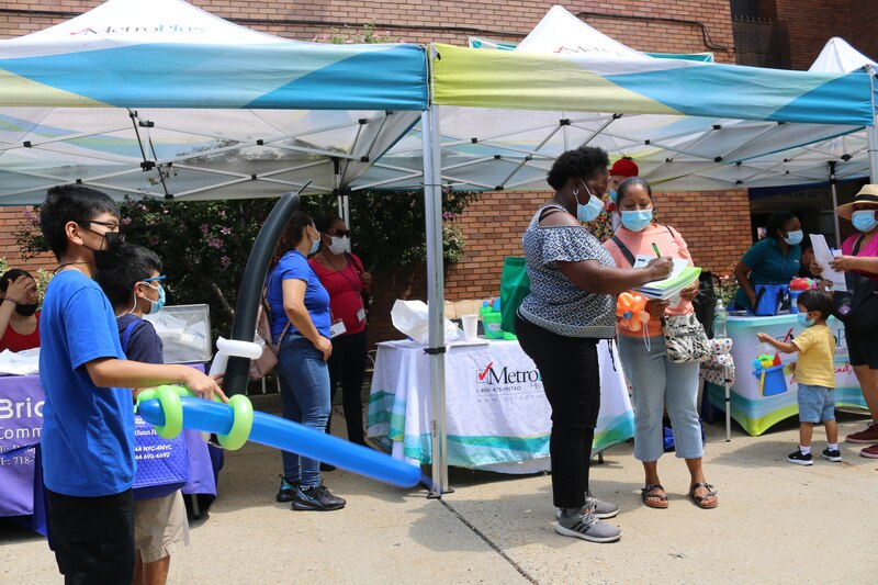 She and a team of people from BronxWorks, the Department of Worker and Consumer Protection, and other local organizations dropped off fliers at a job fair at a local public housing complex, a school where families could pick up free meals, and a summer school site. They made made their way to a block party outside a health clinic, where Velasquez bumped into Rosa Hidalgo scanning the information booths.