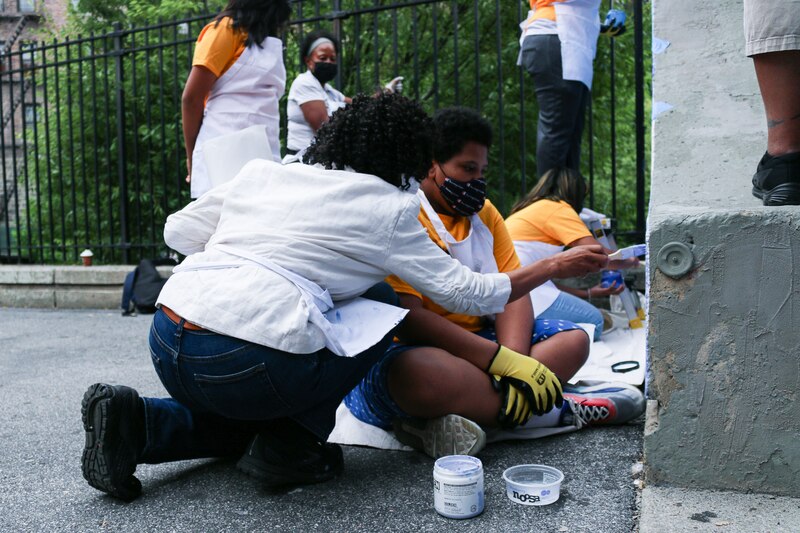 The mural is one of about 200 going up at schools across New York City, funded by $25,000 grants to each school through the city’s Artist Corps, a recovery program through the Department of Cultural Affairs that has sent nearly 400 artists to summer school sites. Mayor Bill de Blasio has touted the corps as reminiscent of President Franklin D. Roosevelt’s New Deal, which funded arts and cultural projects to help lift the country out of the Great Depression.