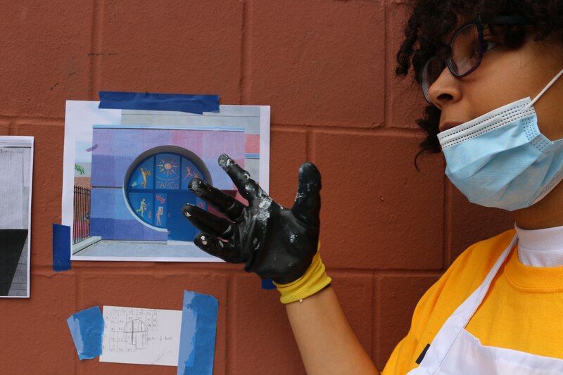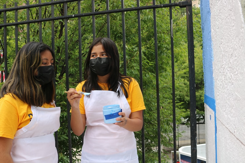 Angel learned remotely last year because his father is at high-risk from complications from the coronavirus — he previously suffered from a collapsed lung. But now Angel is vaccinated, getting caught up in math, and happy to be out of the house. Earlier this week, he sat cross-legged on the ground and added sky-blue paint to the mural.