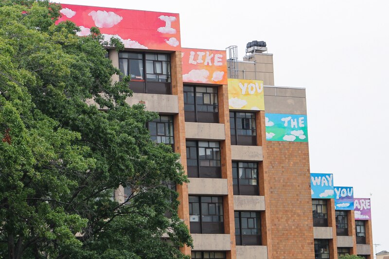As the school prepares to welcome back all of its students this year, the artwork, which is being installed at the student entrance, will greet them. With soft blues, lavender and pinks, it matches the colors of Snyder’s previous mural, which features the message “I like you the way you are” painted across the top of the school building like a banner.