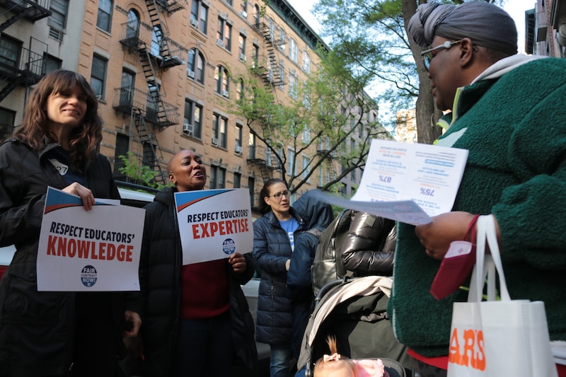 As New York City’s teachers union pushes for a contract, some educators took to the sidewalks during arrival on Monday to call attention to administrative tasks that distract from teaching.