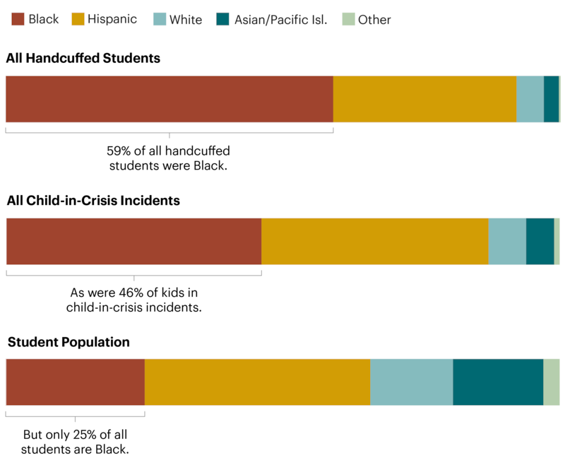 Schools are far more likely to call 911 on Black students, who make up less than a quarter of the student body but account for nearly half of child-in-crisis incidents and 59% of instances in which students were handcuffed since 2017, the analysis shows. And schools continue to call police to respond to young children: Last year, more than 560 child-in-crisis incidents involved students aged 10 or younger. In five cases, the kids were 4 years old.