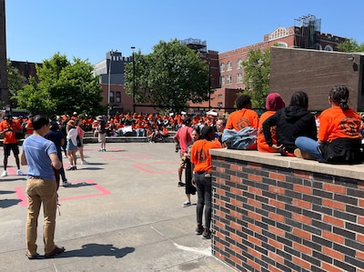 Students and school staff gathered in the plaza last month, sporting orange T-shirts calling for an end to gun violence.