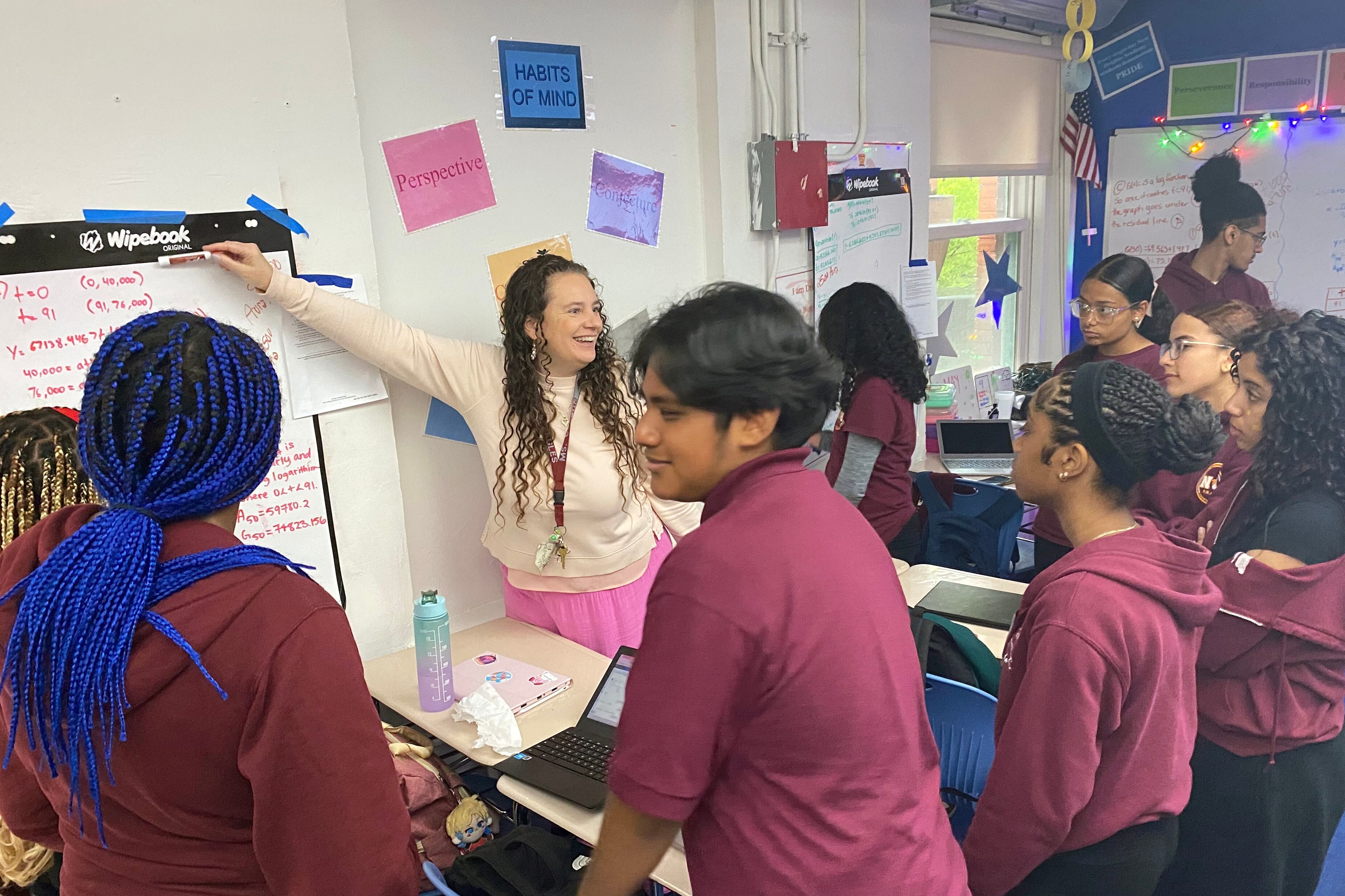 In some ways, the juniors and seniors were forced to engage with their whole bodies: by standing up and doing the work in randomly selected groups of three or four at dry-erase sheets taped around the walls of the classroom at upper Manhattan’s New Heights Academy Charter School.